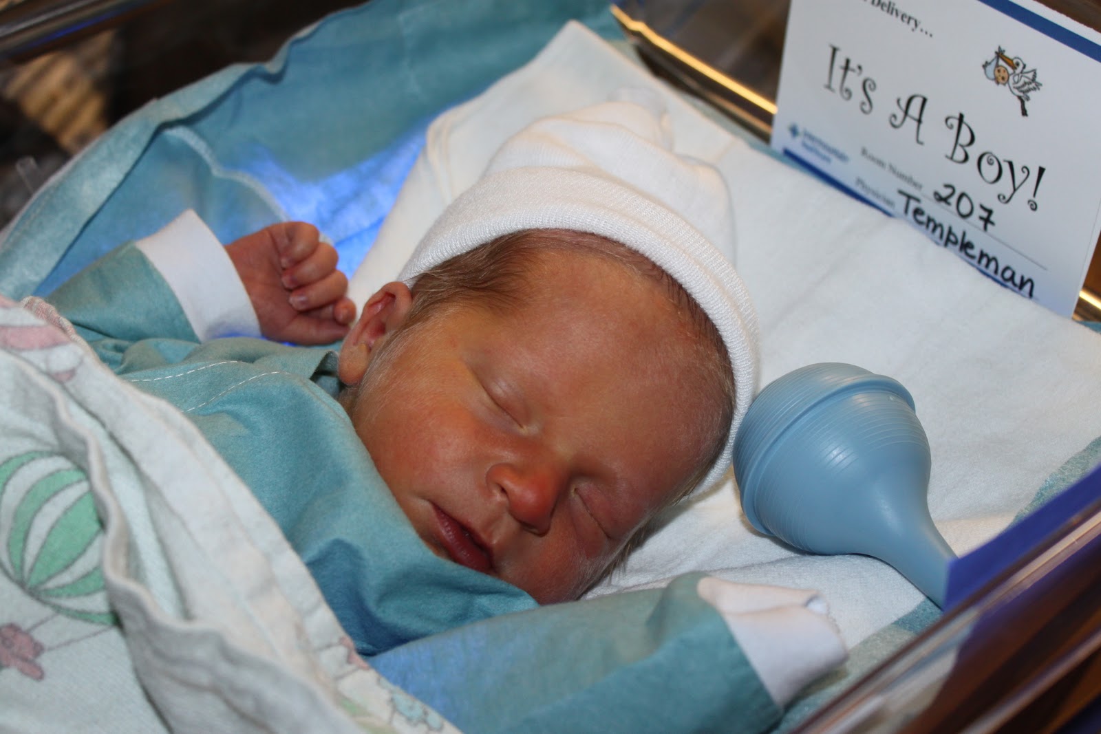 His weight had gone up by almost a half a pound at 6lbs 9oz. He is a growing boy. That is no surprise since Michelle thinks he eats all the time. Dr. Templeman did a few more checks on him and then told us he would give us a call with the results of his bilirubin test as well as the course of action we would need to take.